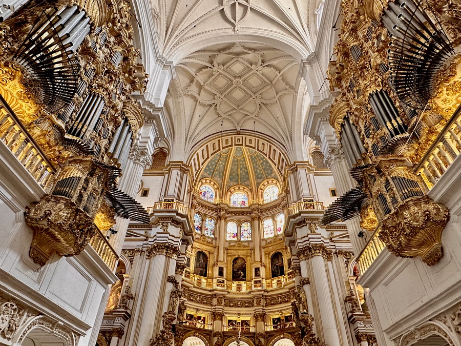 Our first impression when we walked inside the cathedral was how white it all was. The walls, the columns, even the ceiling was white. But far from being plain and austere there was a purity and delicate beauty to it. At the end of the main nave was the Capilla Mayor, or main chapel, glowing with gold and the sunlight coming through the stained glass windows.