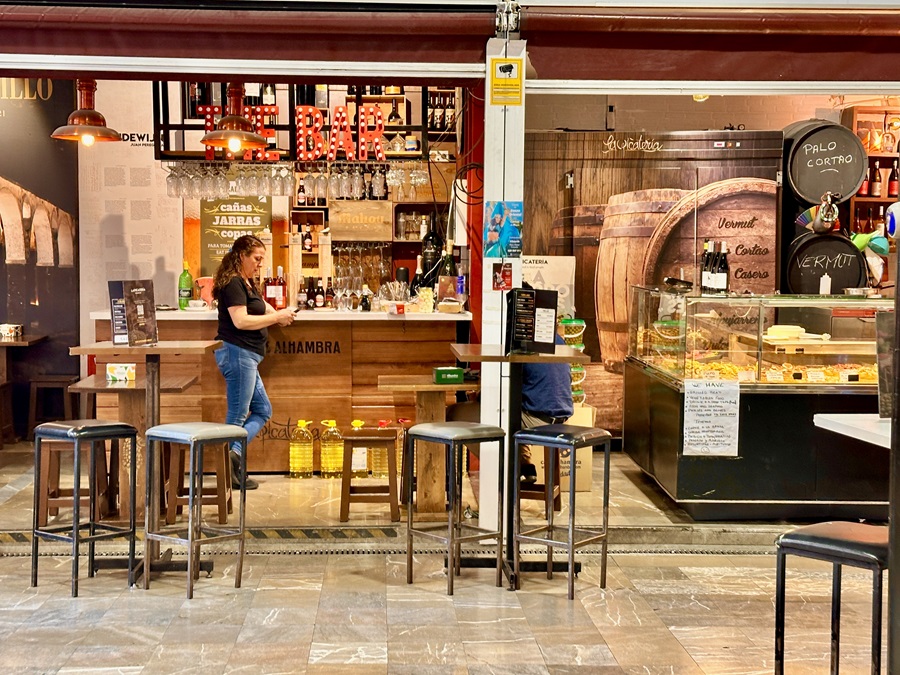 We soon turned off the main roads and into the narrow streets of a district known as Albaicin, a neighbourhood that still retains its old medina character. Our route took us past a tapas bar called La Riviera. I had read they allowed you to choose your complimentary dish and it was true. After taking our drinks order the waiter asked which tapas would we like. On the table there was a small limited menu and I asked for a bocadillo vegetariano and Julie opted for the patas de pulpo.