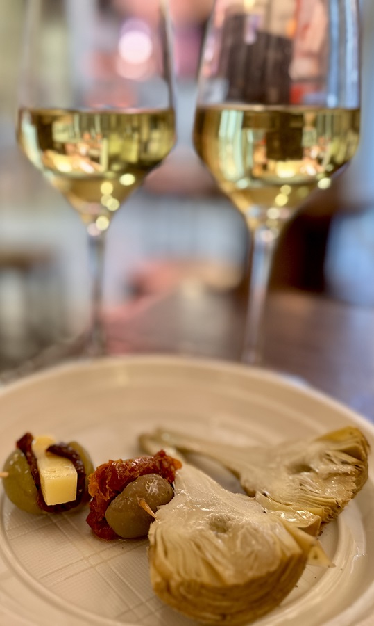 I had made note of a popular bar called La Picateria which we found in the corner near the entrances. There was no one else there but it was early I suppose. Anyway, it didn't put us off as we pulled up a chair in the corner. We ordered a glass of wine each and I chose some nibbles, which was an artichoke heart, (kindly cut in half for me) and skewered olives with sun-dried tomatoes and cheese.