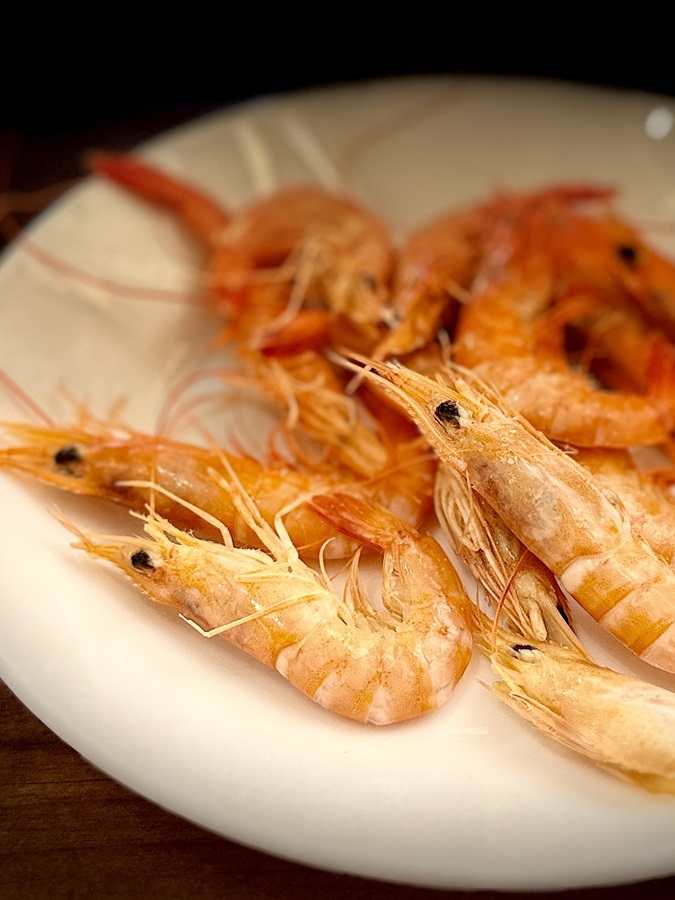 Julie's main course of lamb cutlets was a risk. She often, when on holiday, suffers gnarly boney pieces of badly butchered lamb reluctant to give away its meat, but today she was in luck. They were decent lamb chops and plenty of them. Another glass of wine each was ordered and another plate of tapas followed. It was a pile of grilled prawns. Julie was geting full and couldn't possibly eat any more. She let the waiter know that she was still working her way through the lamb and that I was a vegetarian. "No problem" he said and turned on his heels.