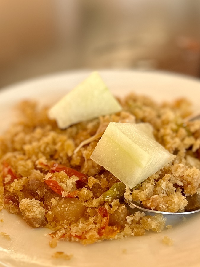 It looked interesting. Julie tested it and declared it unfit for vegetarian consumption for which she apologised but secretly pleased her as she was really enjoying it. It was called migas, a breadcrumb tapas dish. This variation had specks of pork in it as well as pieces of green and red peppers. It was all then lightly fried. "We'll have to try this at home" suggested Julie. "It could easily be meat-free"