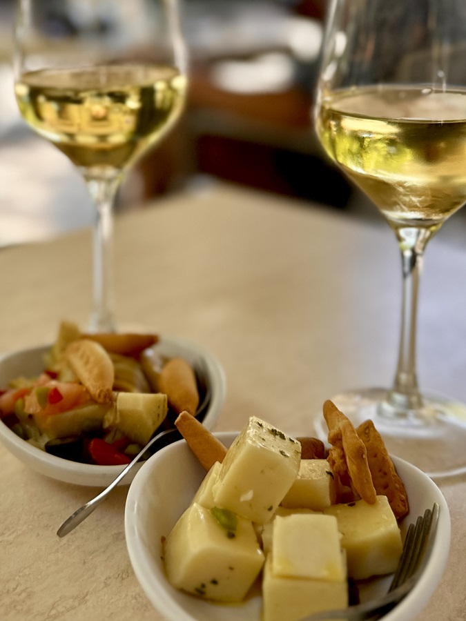 Back outside our wine arrived. It was a wonderful glass of Albariño. I don't think we had come across this grape variety before but we'll be searching it out when we get home. Two small bowls of food also arrived. Some manchego cheese with a few scattered raisins and drizzled with honey. Also a bowl of artichoke salad.