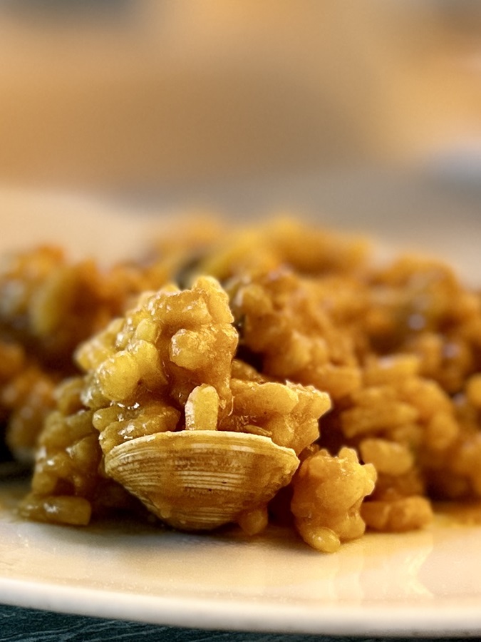 After ordering our food our wine arrived, and of course another tapas plate. "Oh my God, we're going to put weight on this trip" I noted. This time it was a small portion of paella which obviously had clams. Julie had no option but to devour it all by herself.