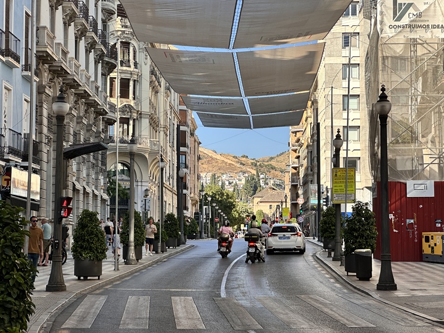 We continued up Calle Acera del Darro, walking in the shade as much as possible. It wasn't so easy along the wide avenue. There were a few trees but not much else to protect us from the sun. When we reached the end of the road we effectively reached the historic centre of the city which brought with it the relief of narrow streets with sails suspended above our heads. They were also mostly pedestrianised which also made for a more relaxing stroll.