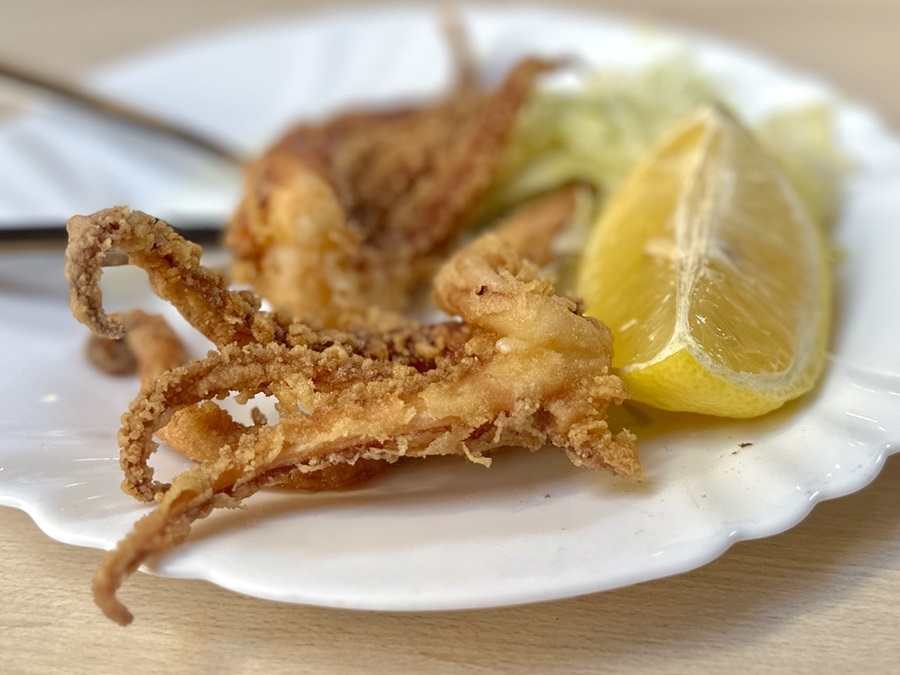 We misread it as patatas de pulpa which in my head sounded a bit like pulped (or mashed) potato. Instead it turned out to be "octopus legs". Julie's face was a picture when they arrived! Good on her though, she did give it a go.