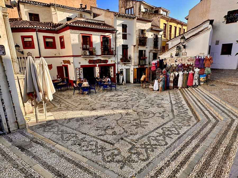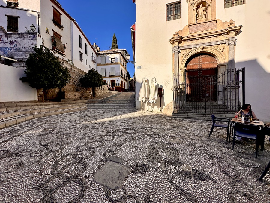 From this approach the floor of the plaza looked spectacular. It was like a mosaic, a large carpet of pebbles. The bar Teteria Las Cuevas had a free table outside so we sat down for a drink.