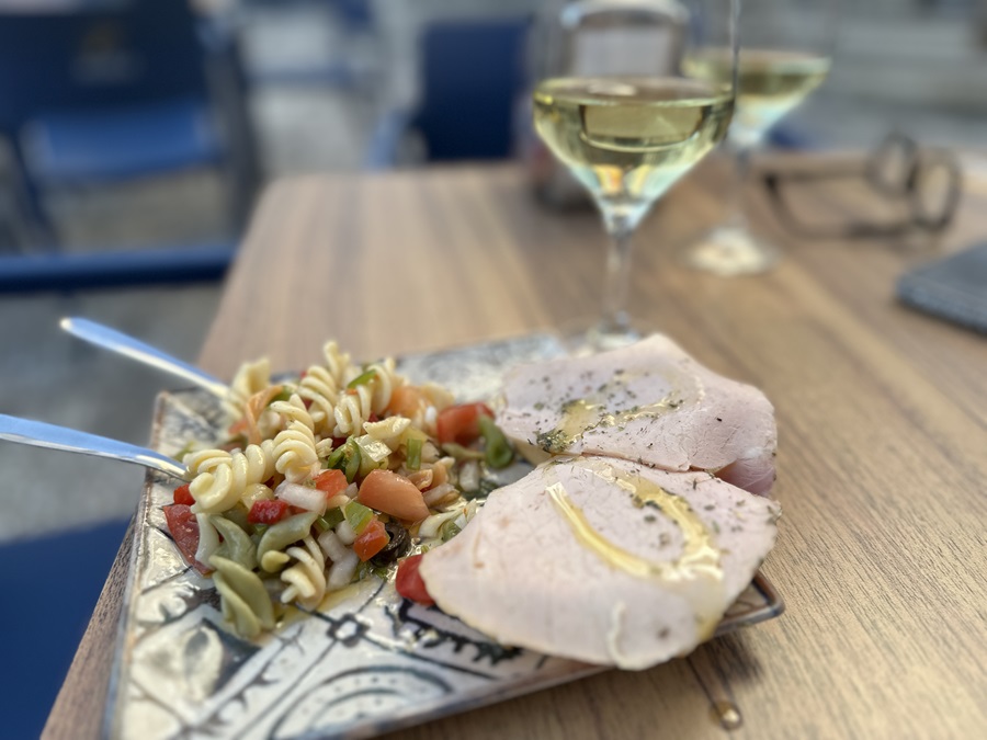 A lovely glass of wine came with a small plate of ham and pasta salad. Famished, I succumbed to my hunger and nibbled the pasta the furthest away from the meat. The wine was again an Albariño and very good.