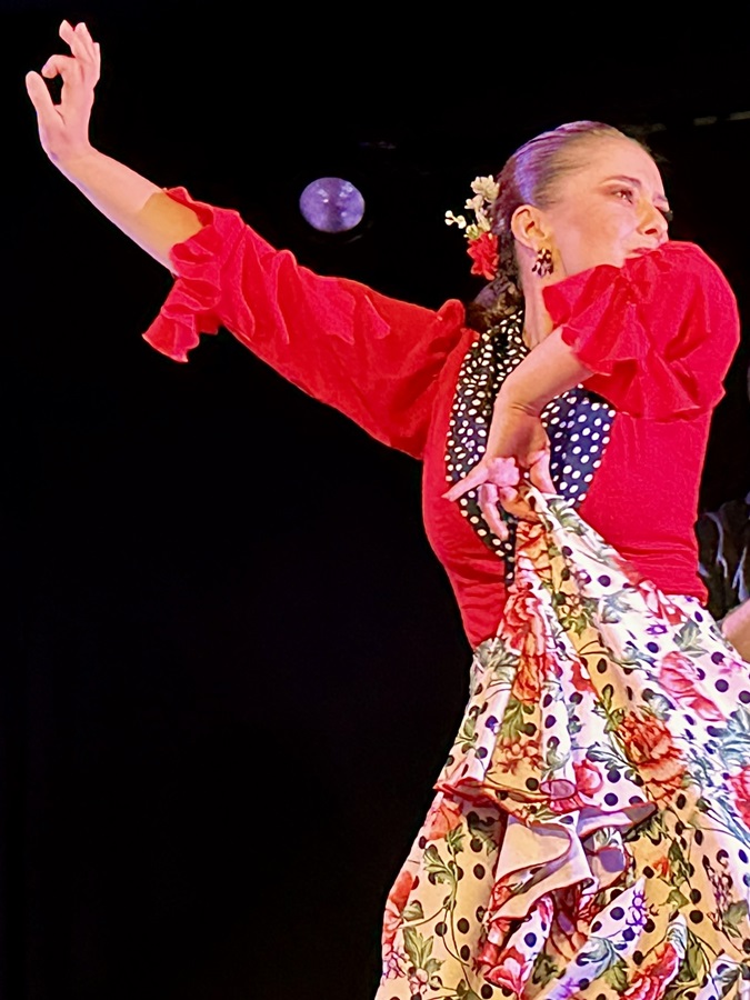We were the first to arrive. I had paid a little extra for front row seats and ours were reserved for us. Whilst we waited we had a look at the many photographs on the walls of the bar to the side of the theatre. They were the faces of flamenco stars of the past full of character and stories to tell. Tonight's line-up was on display. We had Irene Rueda and Saray "La Pitita" as the dancers, the singers were Juan A. Tirado and some bloke from Malaga and the guitarist was Ruben Leva. Over the speakers we had an announcement in Spanish and then English explainng that tonight's performance would be "freestyle" whilst "keeping close to the essence of flamenco". Also they requested they we refrained from taking photos until the end, when we'll get an opportunity to capture the performance. Which of course I obeyed. The lights dimmed and the spotlights illuminated the stage. On stage were a table and three chairs. A young man, with a thin moustache, (which seems to be the fashion these days) walked on carrying his guitar. He sat down. He was followed by the singers, an older bloke with a mop of curly hair (Juan Tirado) and a bearded younger lad (the one from Malaga). They were all dressed in black. The stood to the side, clapping rapidly, as the dancers walked on and sat down. All of a sudden the guitarist began to play, and the dancers began to stamp their feet creating a driving percussion. Juan began to sing, becoming increasingly involved with the song, contorting his face into pained expressions. The vocal performance was full of passion. At times it was closer to a wail, reminscent of Arabic in style. The dancers then got up and joined the performance. It may have been choreographed but it did have the feel of spontineiety, like they were taken by the spirit of the song.
