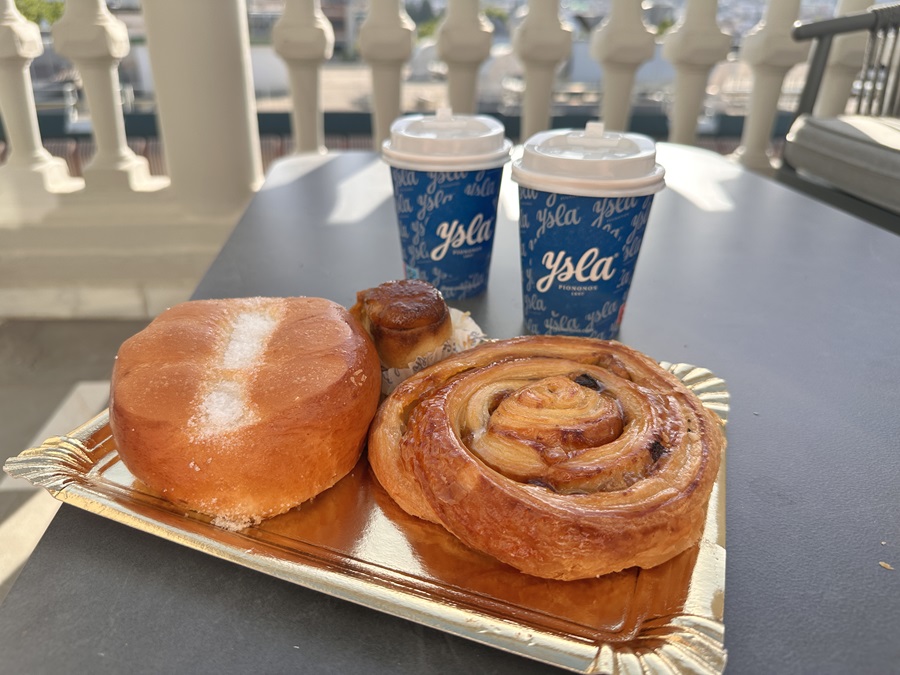 However, we literally had nothing planned for this morning. I resisted the urge to go out and explore the city as we lounged about indulgently. I popped down to Ysla, the cafe on the corner, for a take out cofee and a few pastries. This morning I went for my favourite, a pan au raisin and Julie had the Souza donut again. I also picked up a pionono to try.