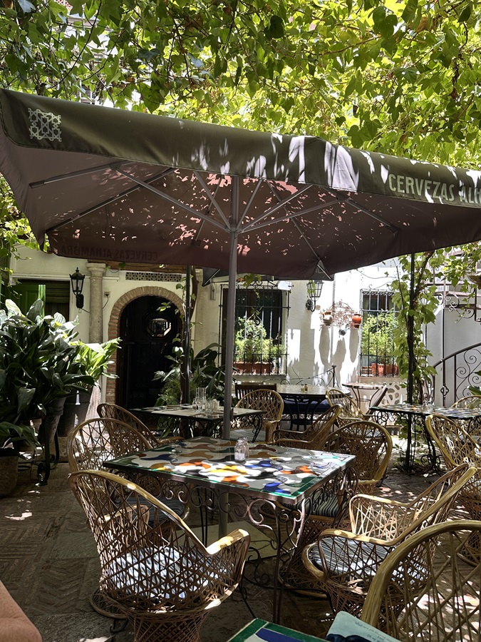 Inside they had this lovely inner courtyard, shaded nicely by the canopy of a few trees. We immediately decided to stay for lunch. Thankfully they had a choice on their menu for me in the form of Salmarejo and a tortilla, the traditional Spanish omelette. The cold soup came out almost immediately. It was served topped with some croutons and flaked tinned tuna! Aaargh! I scooped it all off as quickly as possible. Not wanting to offend I then ate the remaining Salmarejo. Next came my tortilla. I hadn't had one yet so I got to cross it off my tapas bingo card. The full seven inches diameter of egg and potato arrived simply served on the plate with a small side salad.
