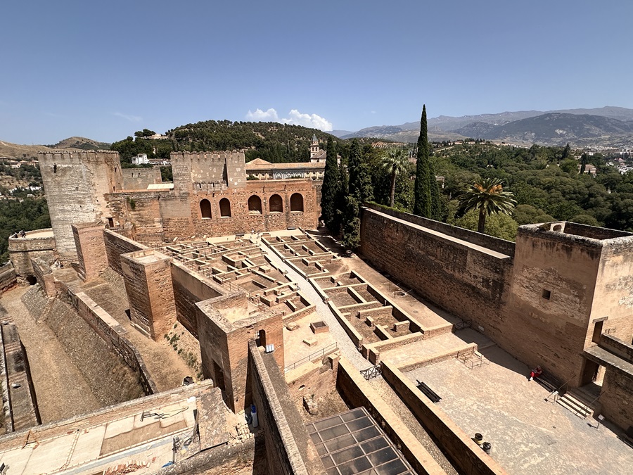We continued along the path through the fort, entering a large courtyard with what looked like an archaeological site of low walls in various rectangular shapes. At the far end was a tall tower, called Torre de la Vela. Julie knew immediately that I would want to climb it and said "I'll wait for you down here" It didn't take me long to walk up the four floors to the top of the 27m tower.