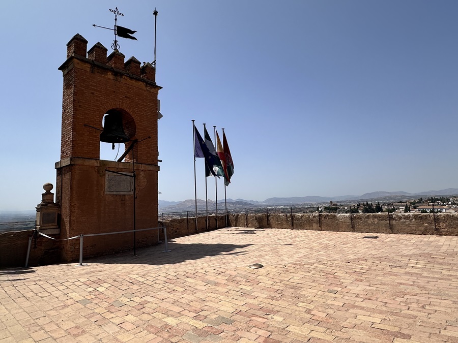 On the Western side there was a small belfry, originally installed following the Christian conquest. To the right were four flags, the blue of Europe, the red and yellow of Spain, the green and white of Andalucia and the green and red of the city of Granada. It was from here, on the 2nd January 1492 that the Christian monarchs raised the flag of Castille over the city signalling the end of the Nasrid dynasty and Islamic rule in Spain.