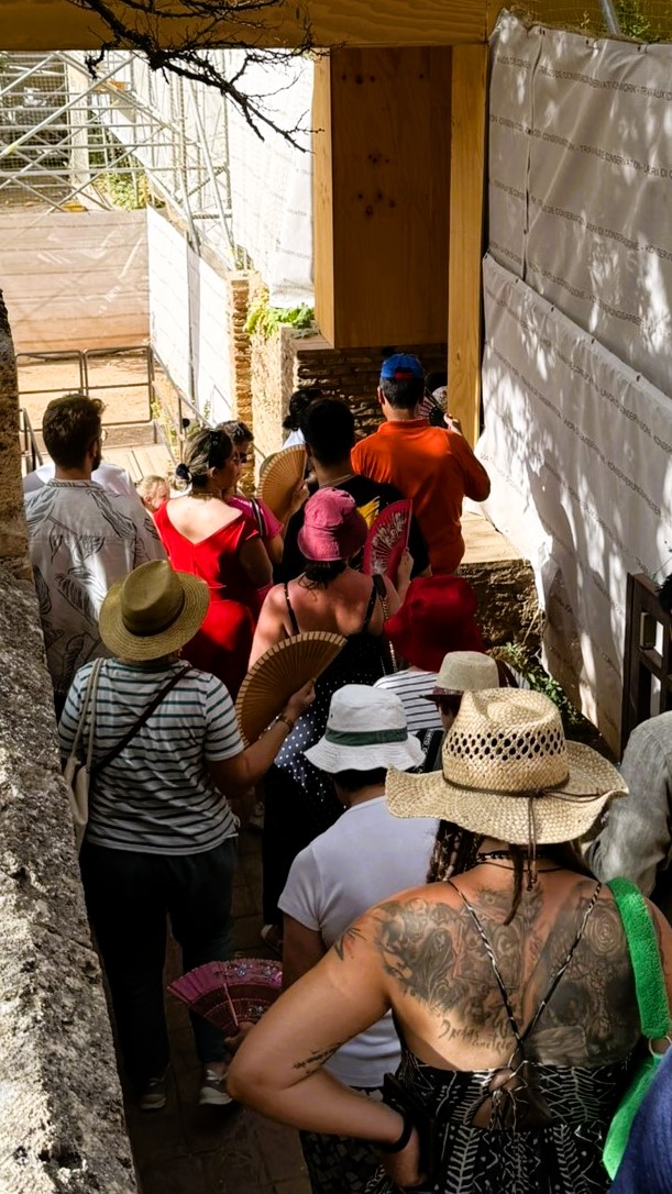 "Agua con gas, grande!" we ordered. The large bottle of water was gulped down in seconds, so we reordered the same again plus a glass of Sangria each. We thought the red wine cocktail would be refreshing but it was far too sweet and we struggled to finish it. However the sugar rush gave us a boost of energy and we soon began feeling normal again. The main entrance was just around the corner. I had prebooked our tickets with an allocated time slot for the Nasrid Palace. So we walked up to the turnstiles and showed our print-at-home tickets. They then asked for some proof of ID. As it happened I had my driving licence with me but Julie had nothing. I showed an image of her passport on the phone but it wasn't good enough. They refused us entry and told Julie to go to the customer service counters. I wasn't allowed to go with her. I sighed my disapproval. So off she went on her own to the headmaster's office, to prove she was who she said she was. Five minutes later she returned validated.