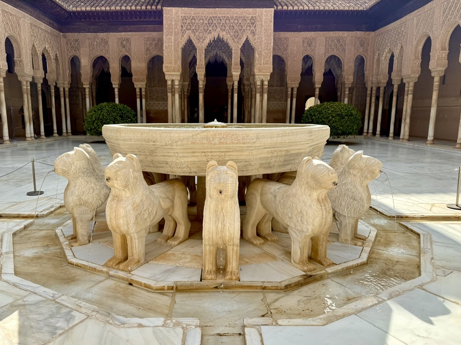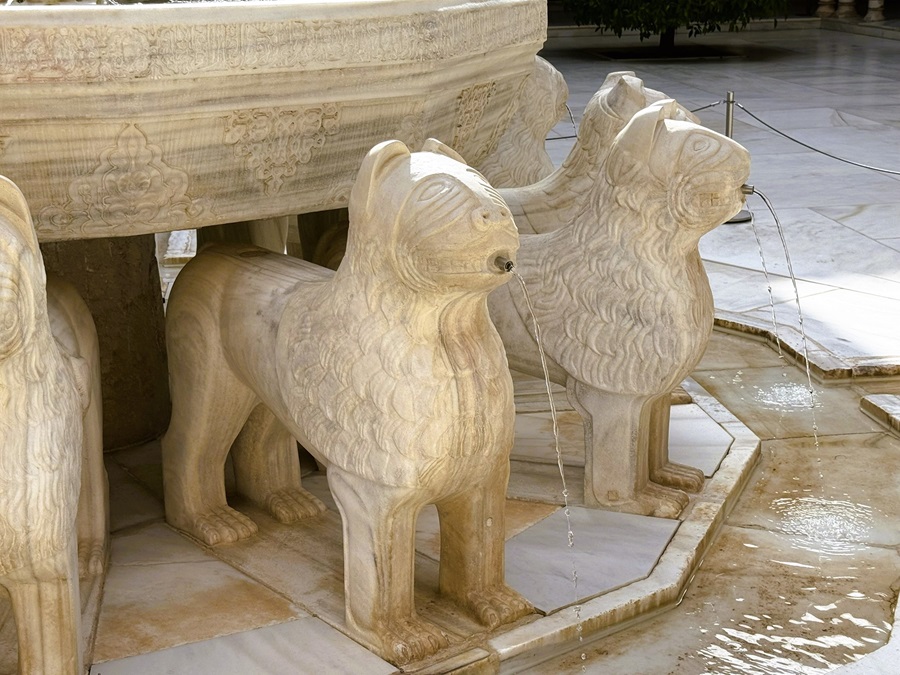 We approached the late 14th century fountain. The marble basin, guarded by a dozen lions was a marvel. The hydraulic system was designed in such a way that the level of water in the basin remained constant, whilst the fountain of water poured out from each lion's mouth.