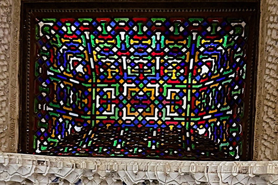 A cordon kept us from entering the room. I saw some people reaching their phones in to room and taking a photo of the ceiling. So I followed their example. I was glad I did because it revealed a stained glass ceiling I would otherwise not have seen. It wasn't especially attractive but its colourful geometric vaulted design was the only example of its kind in the Alhambra.
