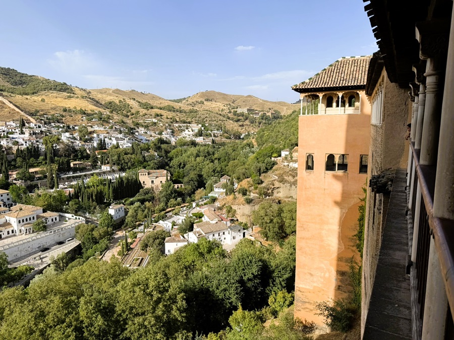 The route took us down a series of stairs which also brought us to the external walls of the Alhambra. We paused briefly to enjoy the view of the Paseo de los Tristes, where we walked earlier and the Palacio de los Cordova, set amongst its forested grounds.