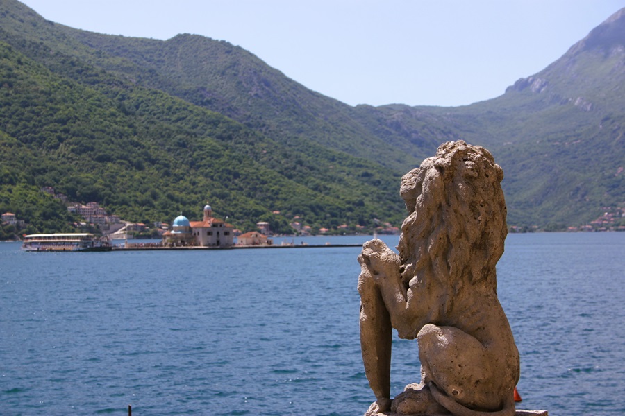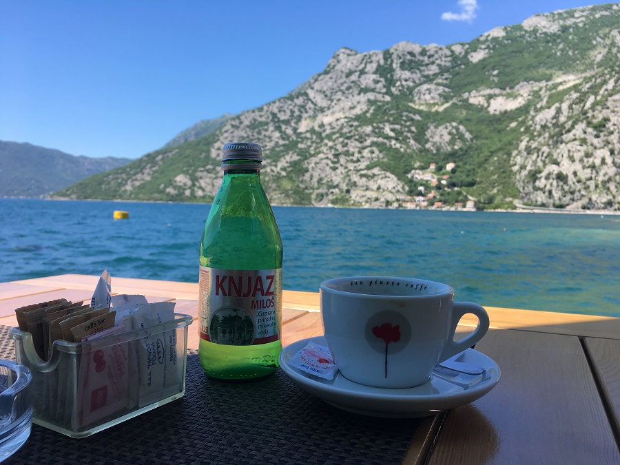 They had some waterfront tables a little further down the road. Missing my morning coffee I ordered an Americano and Julie had water. It was a peaceful spot, despite being on the main road. The water was incredibly clear. We could see the fish swimming deep below the surface. I stared at them for so long they became very hypnotic, which was ironic. We returned to Perast and parked the car. It was a lot busier than when we left with several large coaches taking up all the space. Two guys were directing us to a space but I ignored them and continued all the way down to the end, mostly to drop Julie off with the shopping bags. As it happened there was a spot to park right there. Both unofficial "parking attendants" came down and demanded €2. We knew it was free to park but didn't argue with them. They had the power to look after or not look after our car.