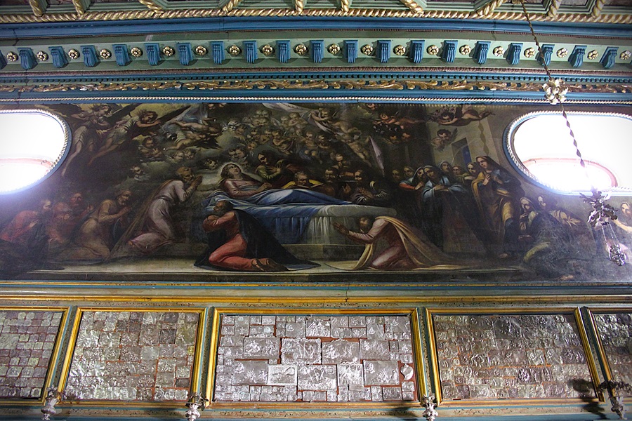 It was dark inside. Some natural light came in from a few windows high up on the right, a small chandelier above the marble altar and a few spotlights. Once my eyes adjusted I began to appreciate the frescoes that covered the walls and ceilings. The scene of the crucifixion above the altar was the largest and most dramatic of them all.