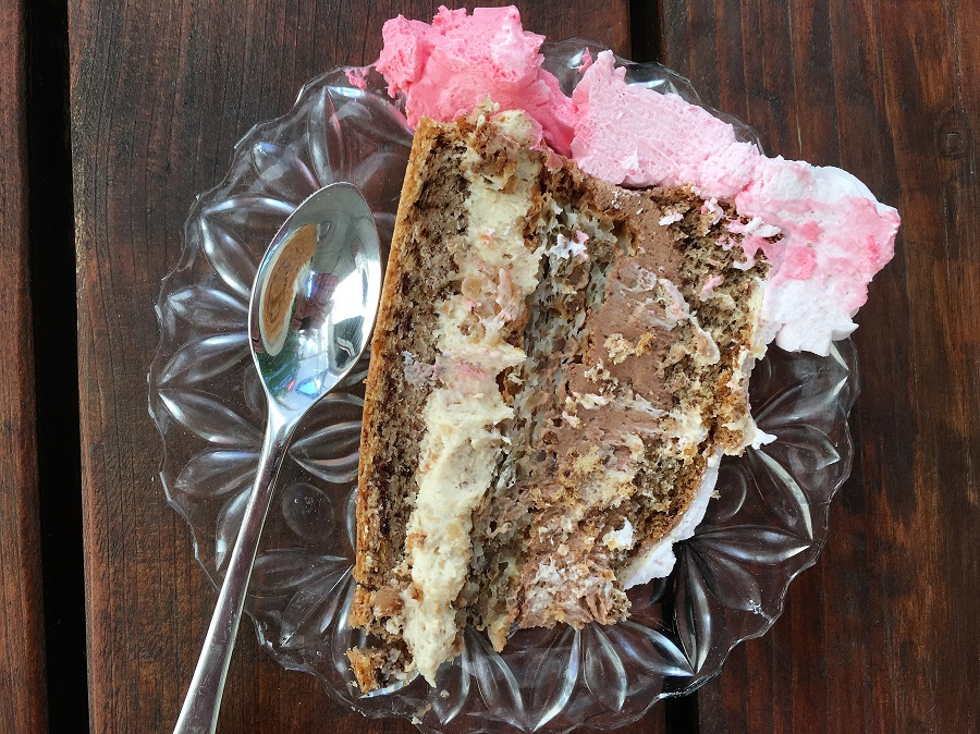 Anita's baptism party was in full swing when we returned to our apartment. Grandpa Milan was busy bouncing an over tired Anita and loving it. We were offered cake, in fact they insisted. It looked horrendous but we were too polite to refuse. There was a small table and chairs outside our door where we sat and ate the cake. Avoiding the alarmingly pink cream, the rest of it was surprisingly nice.