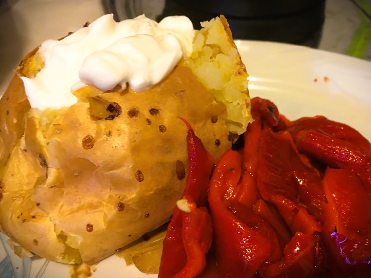 For supper we baked potatoes and filled it with fresh cream cheese. I also opened a jar of roasted red peppers to have with it. Julie had steak. It was small and thin but she really enjoyed it. I also made myself a shopska salad but I struggled grating the cheese. It was far too soft. It was all very tasty though.
