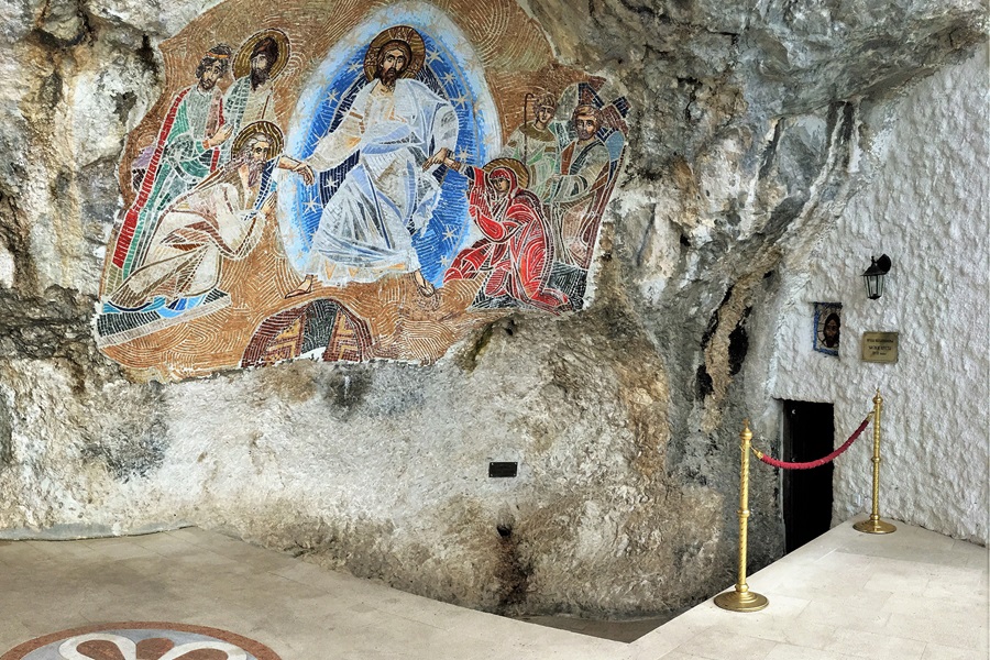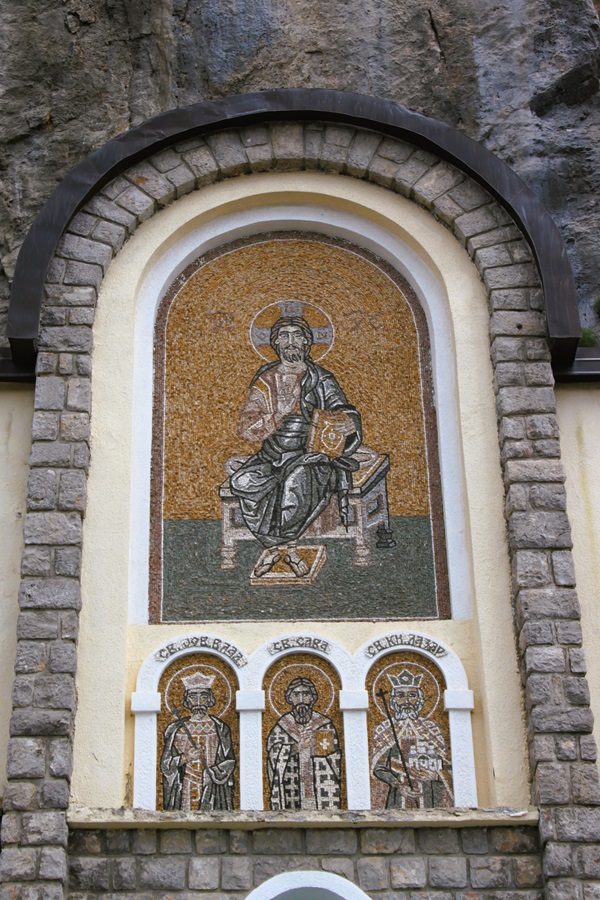 In the courtyard, cut into the rock of the cliff face was the monks' residence and administative building. It wasn't a plain austere structure. Instead it looked like a church itself, with three large arches filled with mosaics of saints. Most of what we see today, even the main monastery, only dates back to 1926. A major fire destroyed much of the complex and it had to be rebuilt.