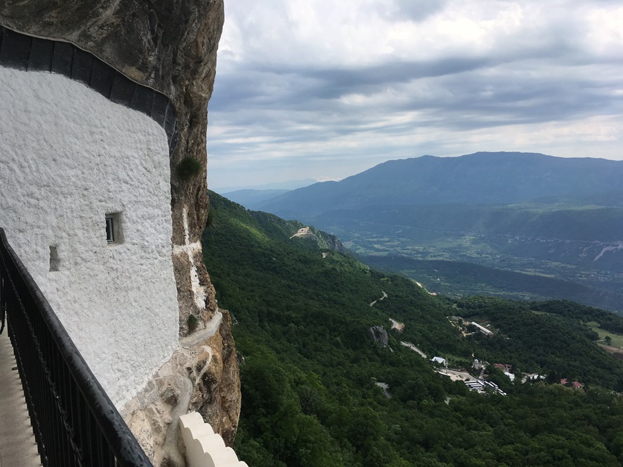 The road got so narrow it felt like it was only wide enough for one car. What made it worse was the drop to our right. Julie was besides herself with fear, especially as she was sat right on the edge. She was praying we didn't meet another car. But we did, three times. I pulled in as far as I dared, slowing down to a stop to allow them the space to squeeze past. By the time we reached the village of Povija we were both pretty traumatised. Fortunately from there on the road wasn't as precarious. When we reached a cluster of coaches near to a few restaurants and the Lower Ostrog Monastery, we both wondered "how the hell" did they get there! The road from the other direction must be much wider. However, our journey wasn't at an end. We turned off the road, snaking up steeply towards the Upper Ostrog Monastery. It was another thrill ride that Julie didn't appreciate. There was one point, and it had to be the narrowest point, we met a car coming down. There was a rock jutting out in the tarmac further complicating matters. The car was edging its way past us. I pulled over as far as I could. I couldn't move any further to the right. Cars behind us were beeping their horns. We were right on the edge. This was the moment Julie thought she was going to die. She was literally quivering. Eventually the car squeezed past, which allowed us to move more to the middle of the road and past the protruding rock. Other obstacles we had to overcome were all the pilgrims. We had to be careful not to hit them as they seemed oblivious to the fact they were walking in the middle of a road.