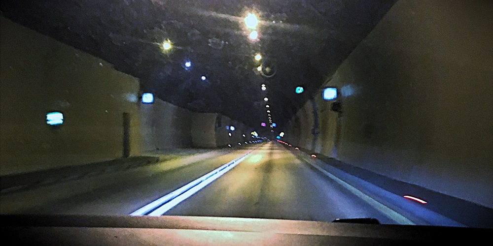 When they arrived we laughed out loud. Not only because they were extremely rustic, nothing more than literally a piece of torn baguette, and a slab of cheese. But also they weren't the lighter choice we were expecting, the bread was the size of a small loaf! At least the homemade cheese was tasty and the bread was softer than it looked. Back on the road we soon came to a toll where we paid €2.50 to use the Sozina tunnel. At over 4km, it was the longest road tunnel in Montenegro. It felt strangely hypnotic driving through this repetitive view, with only the lights giving us a sense of movement. This shortcut through Paštrovska Gora mountain saved us 25km. When we finally emerged the other side we were almost at the Adriatic coast. Moments later we could see the sea for the first time. We began to get a little excitable.