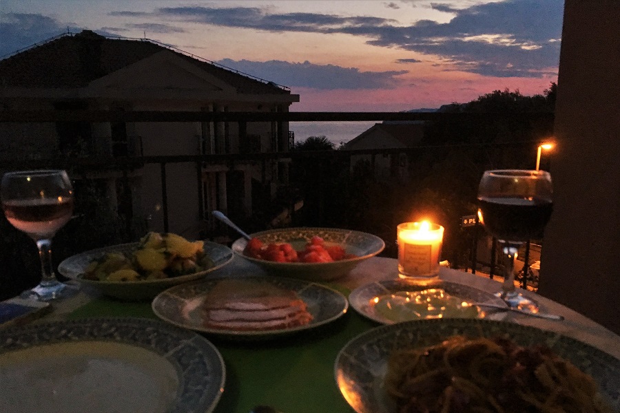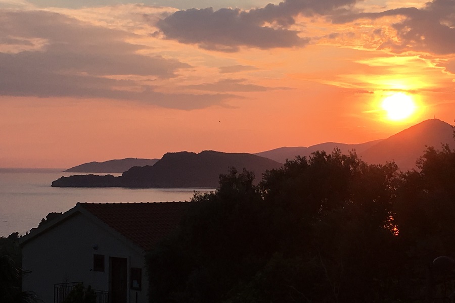 I broke away from sweating over the stove to admire the stunning view of the sun descending behind the hills of Lovcren, and the city of Budva a few miles up the coast.