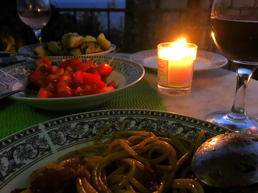 By the end of the day it turned nice again with the sun shaping up for another magnificent sunset. Whilst I was slaving in the kitchen Julie relaxed on the balcony. Despite being a tiny little kitchen it had a hob and two saucepans which was enough for me to make myself a tomato sauce from a bag of ripe tomatoes.