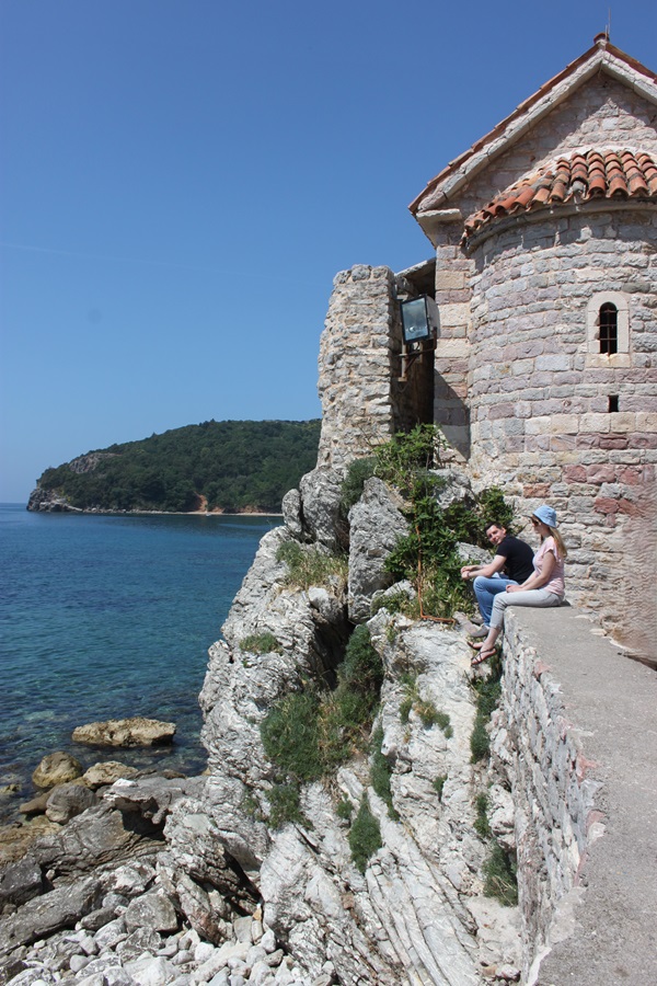 We continued up the steps, towards the small Church of St. Sabbas the Sanctified, built right on the edge of the wall. We joined those admiring the view from the ramparts above the rocky beach below, although Julie refused to sit on the wall like some were doing.