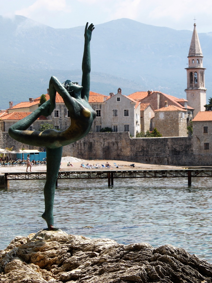 Ričardova Glava beach had a lovely view of the old town, but we continued walking, underneath this huge hotel's swimming pool jutting out over the beach. How on earth did they get planning permission for that?! The path continued, hugging the cliffs, walking over the rocks and the sea on a well-maintined boardwalk. We came across a beautiful bronze statue of a dancer in a graceful position, standing tiptoe on a rock, back arched, holding her right leg behind her, and her left arm reaching for the sky.