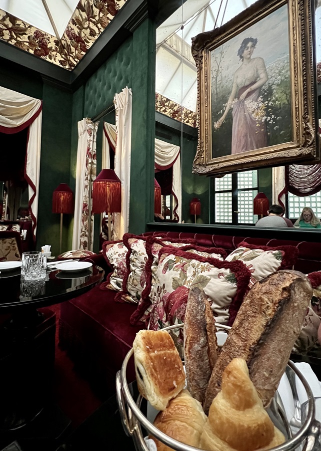 After crawling into bed in the early hours of the morning we didn't crawl back out of our boudoir pit until 10:30am. Fortunately for us they were still serving breakfast. It was served in the green room, the conservatory at the back. A basket of bread and pastries was brought to our table, as well as fresh fruit salad, yogurt, cereal and eggs "how you like it". It wasn't a "help yourself" or "eat as much as you can" buffet. It was a civilised table service with a menu. Everything was included in our room rate except for the smoke salmon. That was an extra €14. Feeling extravagant Julie ordered the salmon and I balanced it out by asking for a plain omelette. It was all very nice but we both agreed not as nice as the Ibis Styles yesterday!