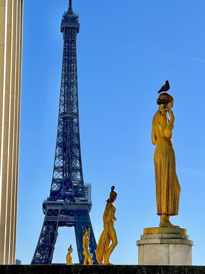 Just around the corner we stood on the esplanade between the two wings of this enormous art deco palace, the Palais de Chaillot, where eight gilded statues, four on each side, created one of the classic view of the Eiffel tower.