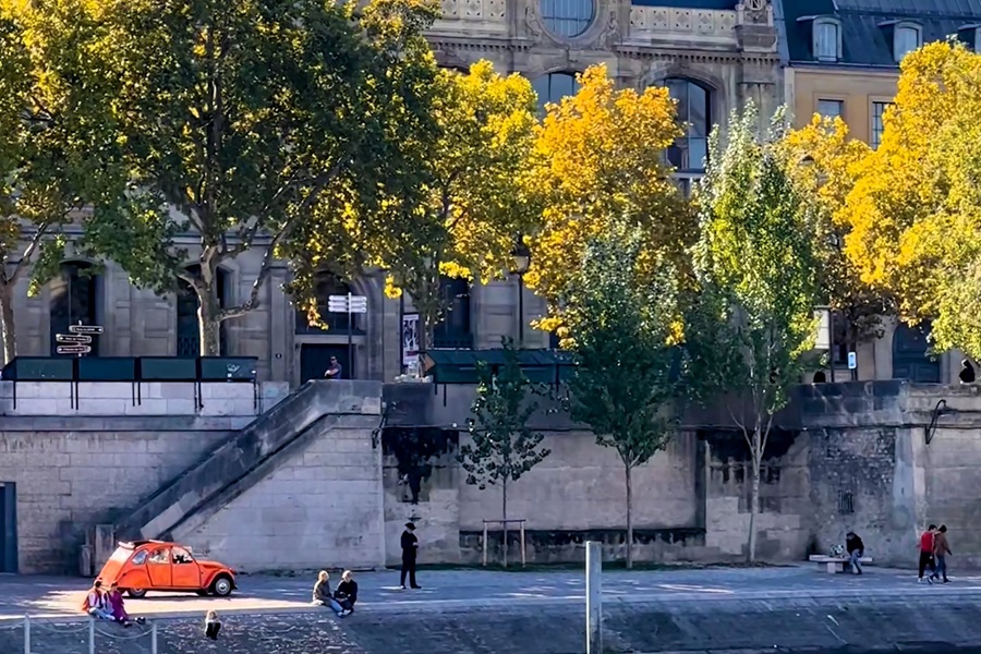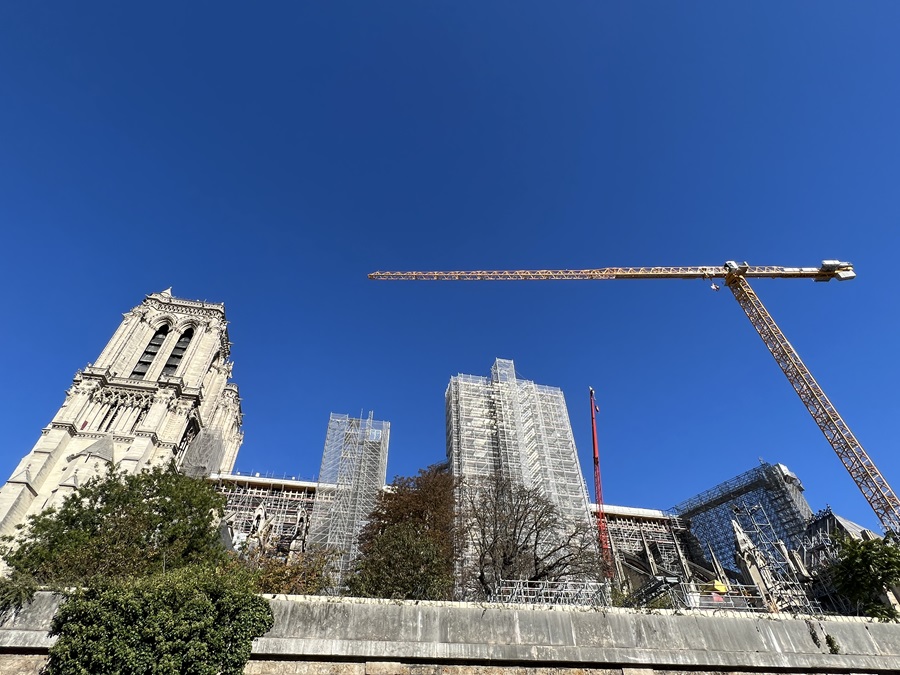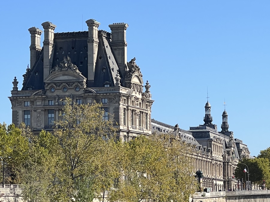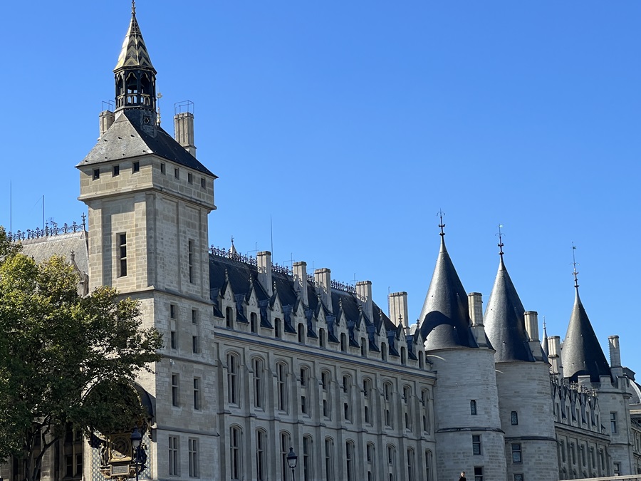 We continued to sail down the Seine, passing the Grand Palais with its spectacular glass roof, built specifically for the 1900 exposition. Then came the Place de la Concorde with its glistening golden tipped obelisk from Luxor before passing on the right the Musee d'Orsay, a former railway station that looked like a palace. It was yet another architectural work of art built during the Belle Epoque. The boat kept a steady pace as we continued upstream. We had a guide, who spoke in French and English to inform us at what we were looking. The thing with being on a boat was we didn't have long before we had drifted past and the moment had gone, moved on to the next landmark. Coming up was the Pavillion de Flore, part of the Louvre Palace, which of course is home to the most famous museum in the world. A little further along and we could see the tip of the glass pyramid. A few minutes later we reached Île de la Cité, the island in the Seine, sailing under Pont Neuf, the oldest bridge in Paris. This was the heart of the city, where it all began. We past the scaffold shrouded Notre Dame Cathedral. The construction site looked even sadder in the daylight. To the right, where we had dinner last night, was an area known as the left bank (because when you travel downstream it's on the left). It was also known as the Sorbonne, a district of Paris filled with educational institutions since the 12th century and synonymous with the phrase "left bank". Our guide explained that our use of being on the left or right of politics originated from the post-revolution French Assembly, where the liberal politicians sat together on the left and the conservative sat on the right, which he suggests was influenced by the Sorbonne, a place of learning and liberal thinking, being on the left bank. The bridges came thick and fast now and after sailing under Pont de la Tournelle the guide asked us all to turn around and look behind us. There, standing on top of a tall stack, was the statue of Saint Geneviève, the patron saint of Paris. Despite welcoming people into the city since 1928, and created by Paul Landowski, a French (of Polish descent) sculptor who's best known for the statue of Christ the Redeemer in Rio de Janeiro, I had not seen nor heard of it before. After one more bridge, the bateaux-mouche slowly manouvred around the tip of the Île de la Cité. It wasn't straightforward for such a long boat but the pilot made it look easy. We were now heading downstream where we passed a striking gothic palace known as the Conciergerie, part of the former palace Palais de la Cité. It was once a courthouse and prison. During the French revolution Marie Antoinette was famously imprisoned here before being sent to the guillotine. I wondered why I hadn't noticed it on the way earlier, but we hadn't been along this stretch of the river. It was on the North side of Île de la Cité.