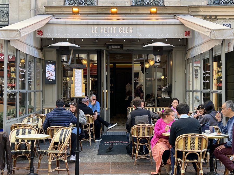The last time we were here we could roam freely around the base and directly beneath it but now a fence kept out the riff raff. Only paying customers could get close. I suppose it also meant only those who have gone through stringent security checks would be allowed anywhere near. The park beyond the Eiffel Tower was also fenced off. It appeared to have been a race on today. It turned out to have been the 116th Paris-Tours road cycling classic. It was all over, every one had gone home, but they had left their mess behind, like discarded race numbers or energy drinks. We moved on. A quick check on Google maps for the nearest restaurant on our short list sent us searching for a pedestrianised cobbled street called Rue Cler, a lively market street harking back to bygone days filled with France' finest artisan producers. The street was bursting with fromageries, chocolateries, boulangeries and cafes. In the middle of it all was the restaurant Le Petit Cler. It came highly recommended. We sat outside, on the pavement, ordered a glass of Cotes de Gascogne wine and a bottle of Grimbergen beer whilst we browsed the menu. The lack of traffic because of its position on a pedestrianised street made for a peaceful location. All we heard were the chatter of the other diners and the clinking of glasses.