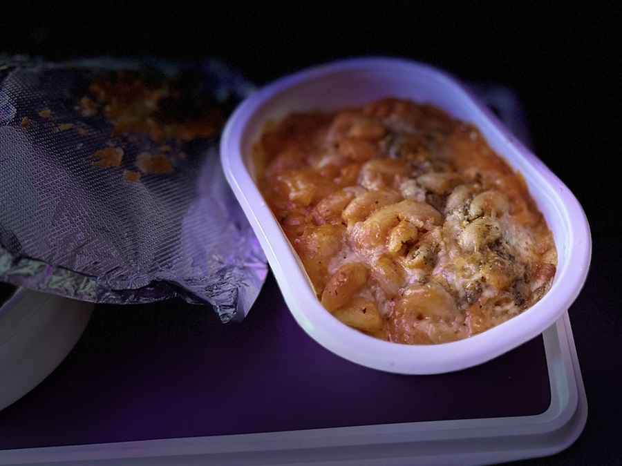 After an hour, hot meals were being served. My pre-booked lacto-ovo vegetarian meal was a tomato and mascarpone pasta, which coincidentally was one of Julie's choices. Either that or a sausage and mash. She opted for the cheesy pasta so I could help her out if she didn't like it. Unfortunately it wasn't very nice. It tasted really processed as if it was made from that horrible orange fake cheese popular in America. I'm sure it wasn't but that's what it tasted like.
