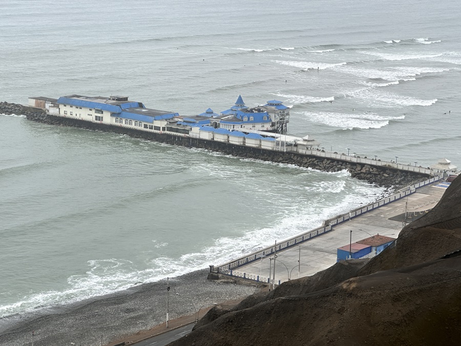 We stopped at a kiosk for a drink of water. None of us fancied the Inca Kola. They had some tables and chairs so we sat down taking a moment to take admire the wonderful view down the Costa Verde. The Miraflores boardwalk was six miles long and had three or four sections to it. Up to this point we had been walking along Malecon de la Riserva. On the other side of a ravine we would come to Malecon Cisneros. From the kiosk we could see Parque del Amor (Park of Love) across the ravine and El Faro de la Marina (the lighthouse) a little further along. We moved on, crossing the Bajada Balta ravine over the Eduardo Villena Ray bridge. It was a long way down. Sadly it became a popular spot for the desperate to throw themselves over the edge to their death; which explained why there was now this protective Perspex cage along both sides of the bridge.
