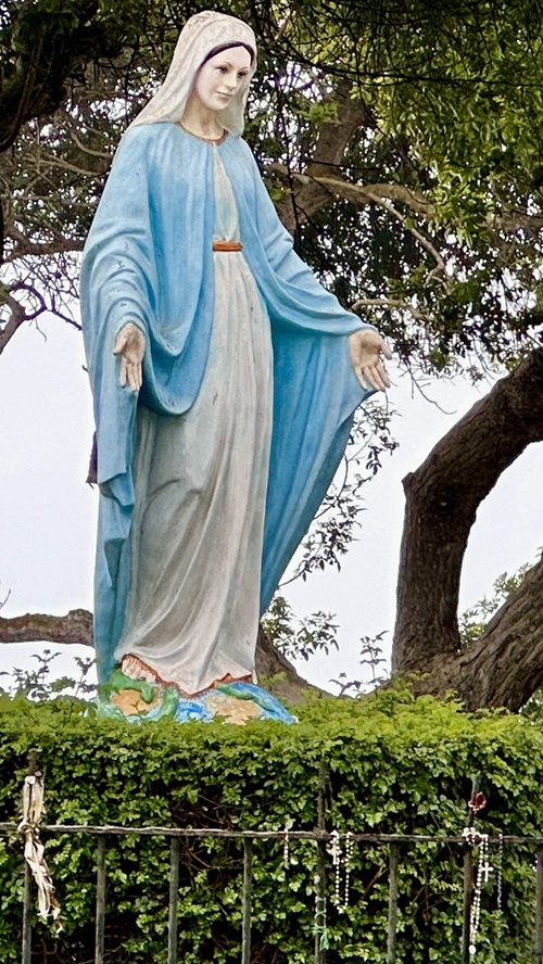 The first we saw was a breakwater or espigon. It had a substantial structure built over it that gave the impression of being a pier. "It looks like Colwyn Bay pier before they pulled it down!" joked Garry. It did have a dilapidated look to it despite it being the location of a very popular restaurant called La Rosa Nautica. Minutes later we walked past a statue of the Virgin Mary in a small park called Parque San Marcelino Champagnalt. Her face was ghostly white and her arms were open and welcoming. People had left rosary beads and flowers on the railings which made a change from "love" padlocks.