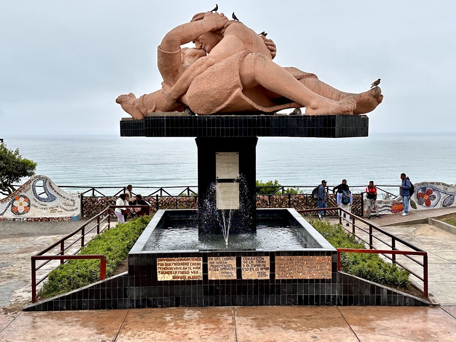 We stood at the viewing platform. The mist was lifting slightly but it still wasn't what you would call a clear day. Directly beneath us was a shopping centre called Larcomar filled with familiar brands like Tommy Hilfiger, Calvin Klein, Gap, even Hush Puppies who I thought had gone bust in the UK. We planned to visit the shops later but first, as we looked up the coast, we decided to walk to see a few landmarks along this front. They were all only a short walk along the Miraflores malecon or boardwalk.