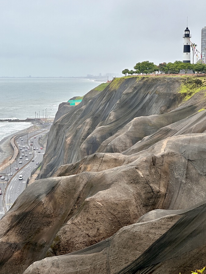 We continued along the malecon, stopping often to admire the incredible view. The cliffs looked stunning from this viewpoint. Erosion had created an undulating ripple to the rock and the fine black mesh that shrouded it gave it a mysterious appearance. I had wondered how the cliffs survived and it was interesting to see how the coast road below created a barrier, protecting the cliffs from the pounding Pacific waves. I'm sure the many high rise buildings along the edge were grateful.