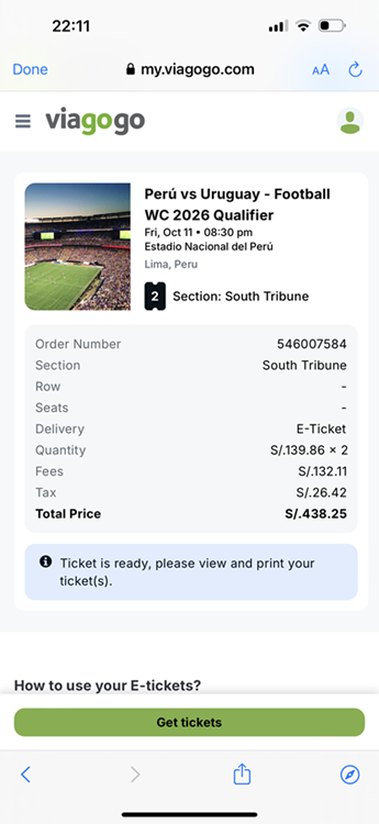 Whilst everyone else were still chewing their Uruguayan steaks I returned to viagogo and the tickets were still available. This time I managed to secure them and pay for them. Although the site slapped another 140 soles fees on top! 50% fees!? Day light robbery! Anyway, we came to the end of the meal. Julie was beaten. She couldn't finish her steak. None of us had room for dessert. So we asked for the bill. We paid and thanked the waiters. Julie took to hugging them as we left. On the way back we stopped at a convenience store. We were looking for some wine and eventually found it behind the counter. I stepped up, pointed at the wine and asked "Vinos Blancos?" The guy behind the counter turned around and reached for some cigarettes! Surely my Spanish wasn't that bad? I repeated myself and played a game of hot or cold with him until he picked up the bottle I was pointing at. But after all that it turned out not to be wine! Eventually I got myself understood and he reached for some vinos blancos in cartons, like fruit juice. It was dirt cheap at 10 soles (£2). Something had tickled Garry and he was doubled up crying with laughter. He chuckled his way back to the hotel. Back in the room Julie fell asleep whilst I stayed up until midnight sorting out the tickets for the game. I had to contact the seller, give them my passport details before they could issue an e-ticket. I don't even think they had any tickets in their possession until then. I'm sure they just went onto the official Peru FA webpage to buy the tickets with my details and got them e-mailed to me. We got there in the end. Next Day >>> |