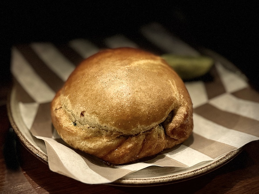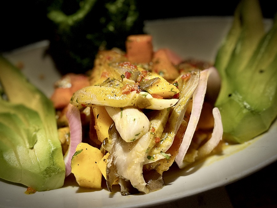 I was very impressed with the menu. They had gathered together all their vegan and vegetarian dishes and had an entire page full of choices. Out of seven starters I opted for the Causita Acevichada de Hongos. Causita meant a little Causa and I had made causa at home before coming, and it was simply mashed potato, Peruvian yellow pepper paste, and some lime juice, with a filling. The causita arrived in a small cast iron skillet, despite it being served cold. It looked amazing. It was topped with pieces of avocado and a ceviche of mushrooms and mango and something shredded that I couldn't quite work out.