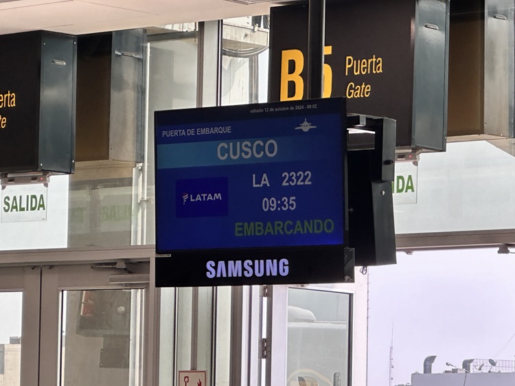 Once we had eaten we still had over an hour to wait at the gate. Julie was feeling especially anxious this morning. She had decided not to have a drink before the flight because being dehydrated (through excessive alcohol) was not recommended when arriving in Cusco. The city was over 3400m above sea level and altitude sickness was a real concern. Boarding was delayed by half an hour which pushed Julie to the edge. She just wanted it over and done with so she could stop worrying about it.