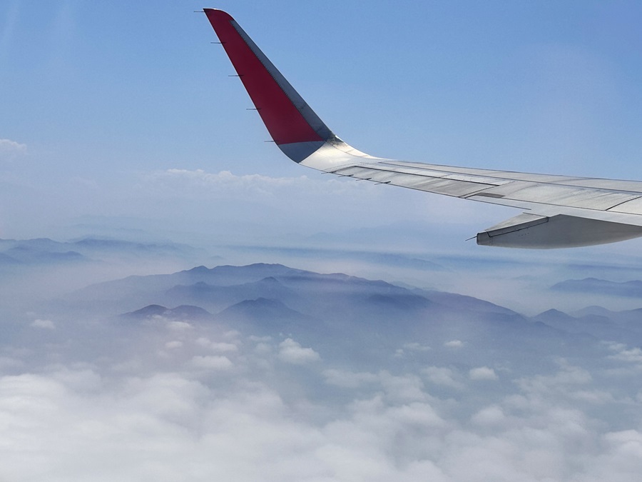 Eventually we set off. It was only a short flight, about 80 minutes, so it wasn't too long for Julie to endure. At first there wasn't much to see out of the window to occupy her but we soon saw some mountain peaks poke above the clouds.