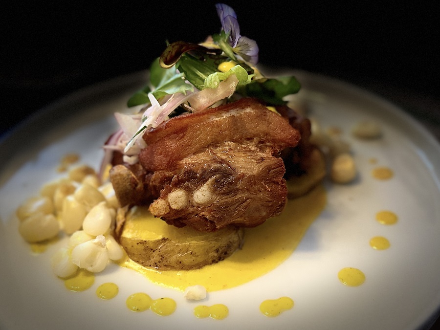 Julie had belly pork, with a few sauté potatoes, salad, large corn kernels, a puddle of yellow pepper sauce with artistically dropped blobs of the sauce, finished off with some edible flowers. They had gone to a lot of effort to make it look presentable.