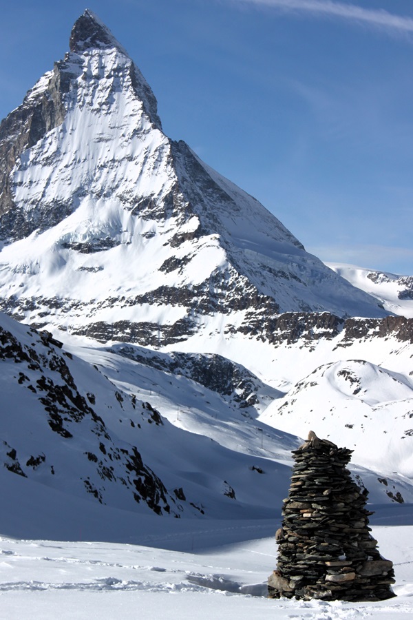 We soon came across a pile of rocks, or a memorial cairn. They are called Steinmännchen in German, and you'll find them dotted around the mountains. I don't know if this one was a tribute to a particular fallen climber or just one that had grown organically as climbers added stones in honour of those who have perished. It could also simply have been a way marker for the path. To be fair the hiking trail was freshly scraped clear. It was quite obvious which way to walk, an important point because there was a lake out there somewhere! The Riffelsee was a popular attraction in the Summer months when on a still day you can picture the Matterhorn reflected in its mirror-like waters. Today it must have frozen over and then covered with a layer of snow. So it was important to stay to the path!