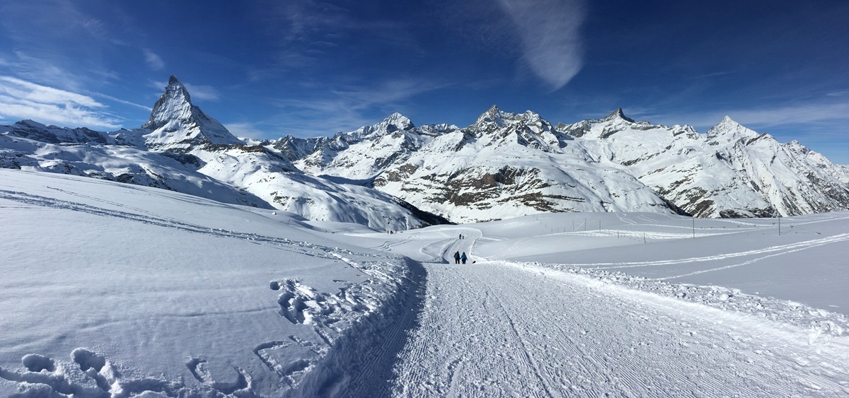 Along the way I remembered an interesting fact. A quarter of the Matterhorn was actually in Italy. The two sides we could see from our trail, the East facing and North facing were in Switzerland, as was the Western side. But the South facing was over the border. It even has a different name in Italian, where it's called Cervino. The Italian/Swiss border ran along the ridges connecting the chain of peaks, sharing the glory of the Pennine Alps between the two countries. The wanderweg continued along a wide cleared path. It was the perfect winter hike. The snow made for level ground which meant we didn't have to focus too much on where we placed our feet. I've seen images of it in summer and the stoney path is full of trip hazards. You could easily twist an ankle if you weren't concentrating. On this stretch of the trail we could appreciate the chain of peaks of Dente Blanche, Ober Gabelhorn, Zinalrothorn and Weisshorn to name but a few. Hurrying past us was a family, with two teenagers larking about, taking short-cuts into the deep snow. They had this beautiful black and white dog, similar to a tall large Spaniel that reminded us of so much of Sylvester, our Border Collie cross Springer Spaniel. Naturally we connected with them and asked "What breed is he?" "He's a Dutch cross breed" they said "a Stabijhoun and a Wetterhoun", a Pointer and a Water Dog, both Friesian. If we ever have another dog after Sylvester it will be the Stabyhoun! After twenty minutes of marching in the snow the path changed course, turning North. We were now looking straight down the Mattertal valley. Zermatt was down there somewhere. In the foreground were a collection of buildings which constituted Riffelberg.