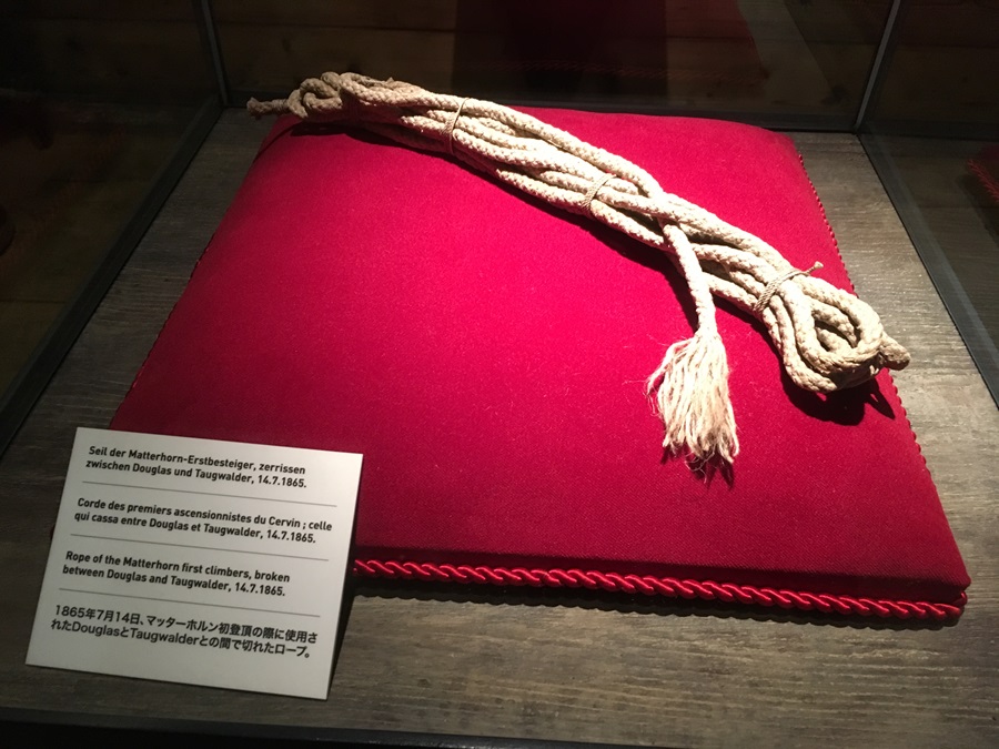 On display was the rope that broke when four of the climbing expedition for the first ascent of the Matterhorn fell to their death. An inquiry into the accident was held to establish the facts. During the descent Douglas Hadow slipped and fell into Michel Croz. They both tumbled pulling down with them Charles Hudson and Lord Francis Douglas. Rumours were circulating that mountain guide Peter Taugwalder (senior) cut the rope to save himself, his son (also called Peter), and Edward Whymper who were both above him. However, the inquiry acquited him, coming to the conclusion that the rope was weak and snapped under the shock of the weight.