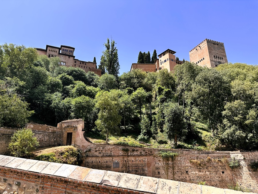 The route took us down a series of stairs which also brought us to the external walls of the Alhambra. We paused briefly to enjoy the view of the Paseo de los Tristes, where we walked earlier and the Palacio de los Cordova, set amongst its forested grounds.