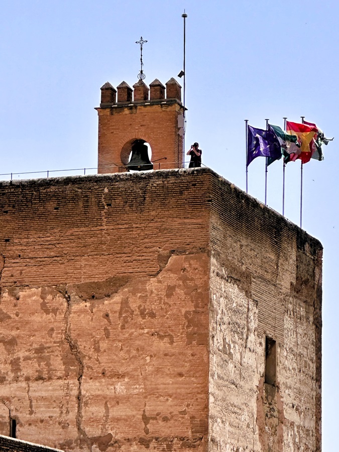 On the Western side there was a small belfry, originally installed following the Christian conquest. To the right were four flags, the blue of Europe, the red and yellow of Spain, the green and white of Andalucia and the green and red of the city of Granada. It was from here, on the 2nd January 1492 that the Christian monarchs raised the flag of Castille over the city signalling the end of the Nasrid dynasty and Islamic rule in Spain.